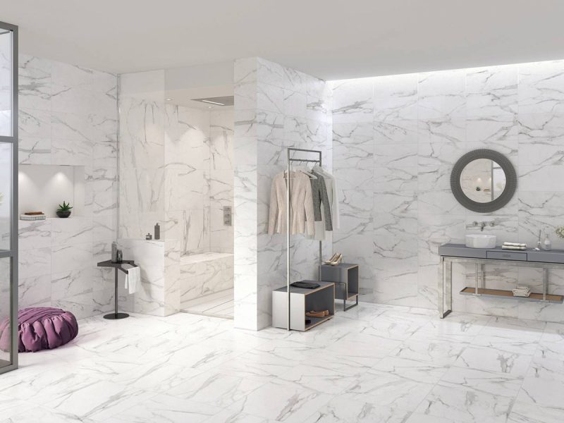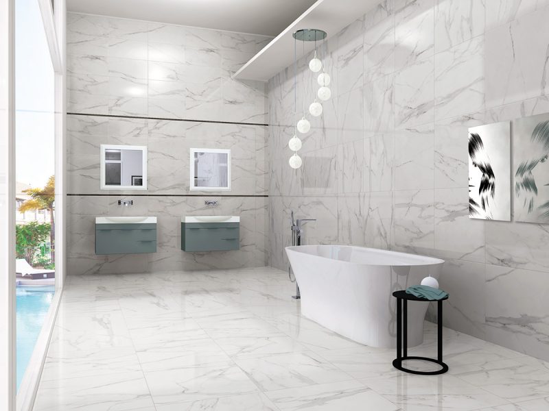 These calacatta-inspired tiles are ideal for creating a stylish & luxurious room, in both residential and commercial settings. Beta features a white base with silvery-grey veins in random patterns, offering a clean and modern look. The bold, dramatic veining offers a unique, high-end look suitable for a variety of spaces. Delta, with its warm cream background and gold veining, provides a sophisticated contrast, bringing warmth and depth to interiors.